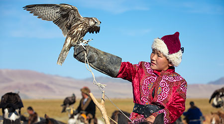 Young Mongolian boy in traditional Mongolian dress training with falcons, Ulgii, Mongolia.