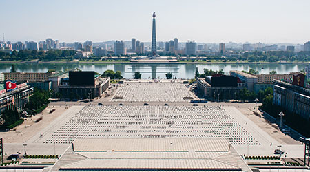 View across Pyongyang from Kim Il-sung Square of the Juche Tower and Taedong River