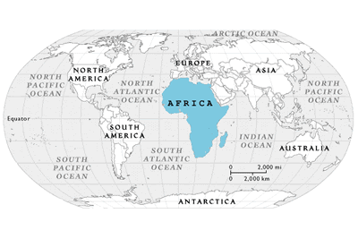 Africa is in blue. Utah is in North America. Can you find North America? Is North America close to Africa or far away? It takes about 24 hours to fly on a plane from Utah to Ouelessebougou.