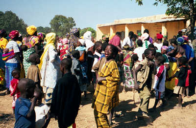 These people are dancing and singing while the drums are playing. The women dance in a circle and the children dance on the outside of the circle if they want to. How many women do you see carrying babies on their backs? How do mothers in your community carry their babies?