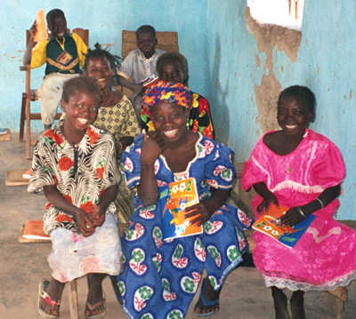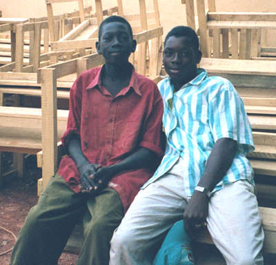 Here are some teenage boys resting on wooden benches. The benches they are sitting on were delivered to the schools in the Ouelessebougou area in November 2000 so the kids have better benches to sit on and a place to hold their notebooks so they can write more comfortably. The one on the left is named Abraham. Do you see any ways that these boys dress differently than you?