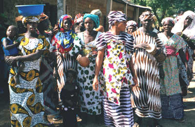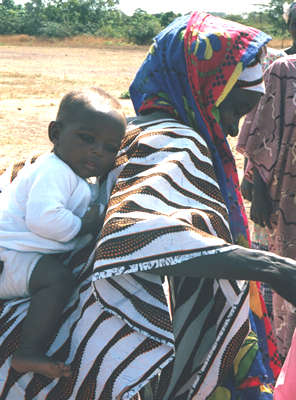 This woman is dancing with her baby on her back. Mothers wrap their babies on their backs with a piece of cloth. That way they can work at home or in the gardens and still have their babies with them. Can you see the cloth that is holding him on his mother's back?