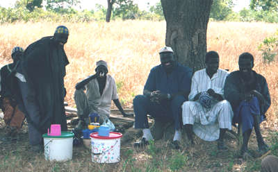 Here are some men sitting under a tree. They are about to eat lunch which is in the large buckets. They're having rice and peanut sauce with some vegetables mixed in for lunch. They don't use knives, forks, or spoons. So what do you think they use to eat with? They eat with their hands. Can you think of any advantages to eating with your hands instead of utensils?