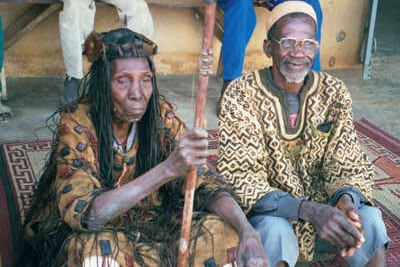These 2 men live in a village called Sena. The one on the left is the chief of the village. The long stringy stuff is part of his hat, not his hair. What do you think his hat is made of? The man on the right is wearing a shirt made of mudcloth. It is made by starting with a beige colored piece of material and then is dyed with mud to make the dark colored designs.