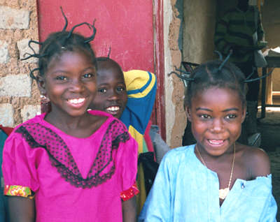 These girls' hair is wrapped with thin black wire to make it stand up. Look at the wall of their school. What is between the bricks?