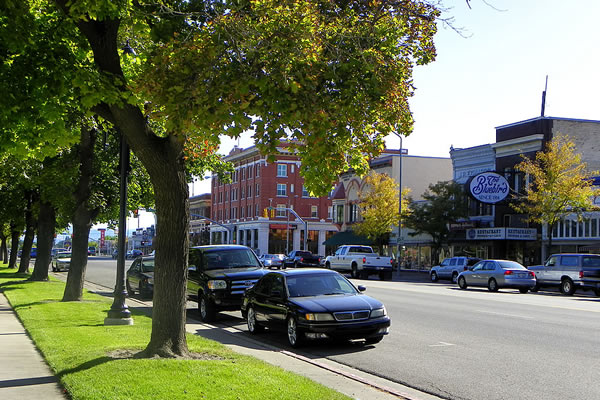 Main Street in downtown Logan, Utah, features a mix of historic buildings, local shops, restaurants and views of the nearby mountains.