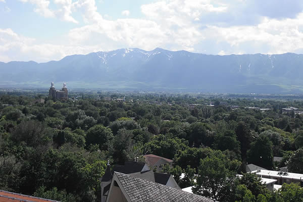 A partial view of Cache Valley, Utah, reveals the Wellsville Mountain range to the east and the iconic Logan Temple in the distance, blending natural beauty with historical landmarks.