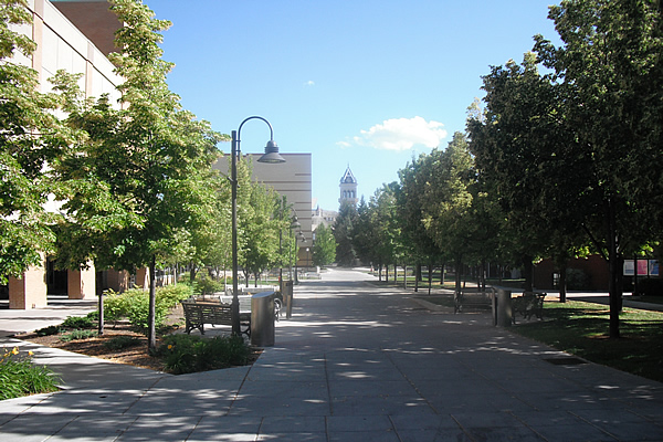 A view from Utah State University near the Taggart Student Center includes campus walkways, student gathering areas and a backdrop of the Bear River Mountains.