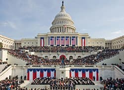 The inauguration is the ceremony of installing the new or reelected president in office. It is held at noon on January 20 after the election. During the inauguration ceremony the new president takes the oath of office from the chief justice of the United States. With right hand raised and left hand on an open Bible, the new president says: "I do solemnly swear that I will faithfully execute the office of President of the United States, and will to the best of my ability, preserve, protect and defend the Constitution of the United States." Test your inauguration knowledge with this online quiz.