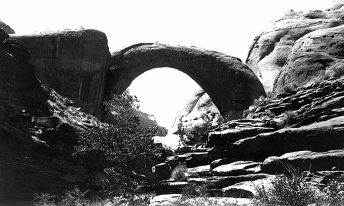 Located on the northwest flank of 10,000-foot-high Navajo Mountain, Rainbow Bridge lies on the floor of a deep sandstone canyon, whose sheer cliffs rise as much as 1,000 feet. The setting was so spectacular that Zane Grey wrote a novel entitled Rainbow Bridge, in which the natural bridge takes on a mystical aspect. Former president Theodore Roosevelt, on a visit in 1913, wrote that he awakened several times in the moonlit night to gaze silently at the looming arch.